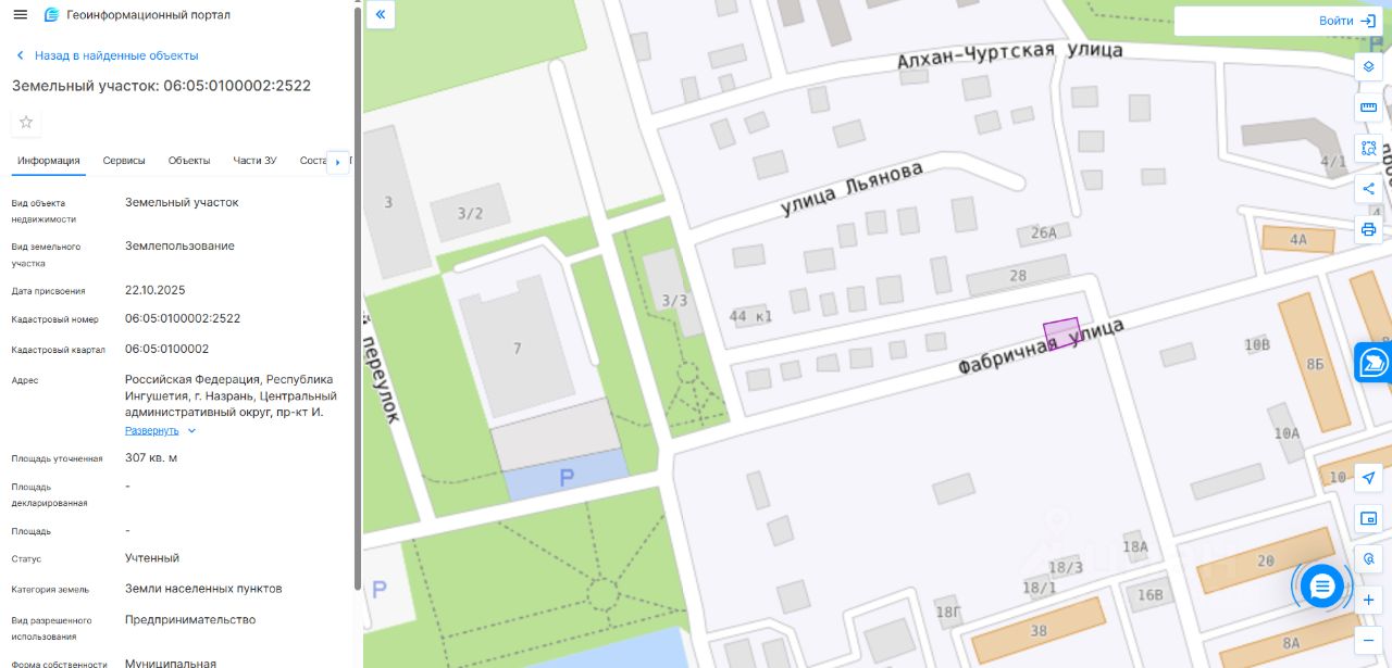 Земельный участок с кадастровым номером 06:05:0100001:2522 и площадью 307 кв. м, расположенный по адресу: Российская Федерация, Республика Ингушетия, г. Назрань, Центральный административный округ, пр. им. И. Базоркина, с разрешенным использованием "предпринимательство", для использования под установку торгового павильона.