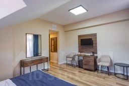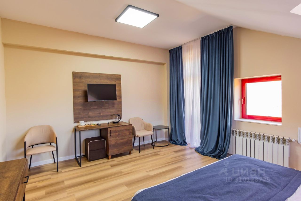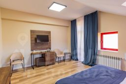 Просторный улучшенный номер с окнами на курортную территорию и Кавказские горы. Двуспальная кровать, письменный стол, стул, диван и две прикроватных тумбы. Просторная ванная комната с умывальником, косметикой для ванной, зубной набор и полноразмерная ванна. В номере имеется телевизор, посуда, фен, тапочки.